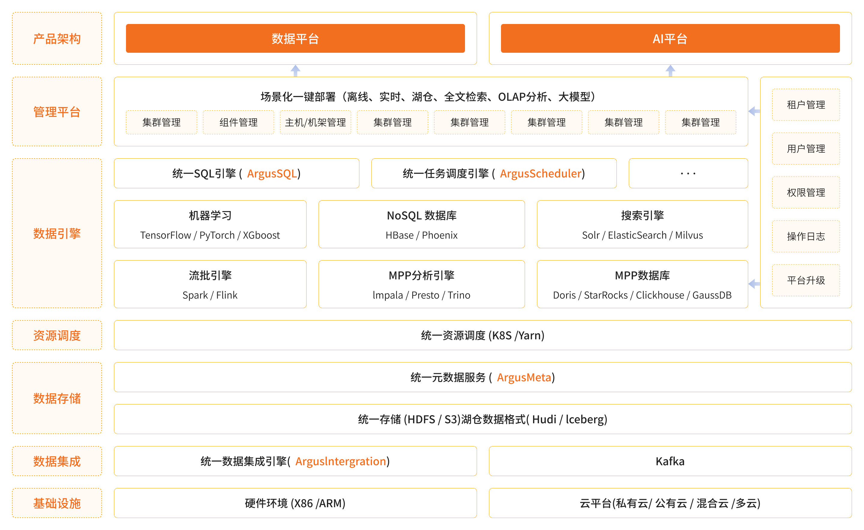 随着数据的日益增长,企业在大数据存储、计算等领域中管理和运维的难度急剧上升,成为限制企业数据应用发展的关键。ArgusEngine为企业提供一站式大数据基础设施管理平台,支持大数据组件、数据湖组件、分析型组件和AI组件的深度整合和优化,显著提升大数据底座的稳定性和性能。支持企业更好地挖掘和利用数据资产,提升整体业务竞争力。